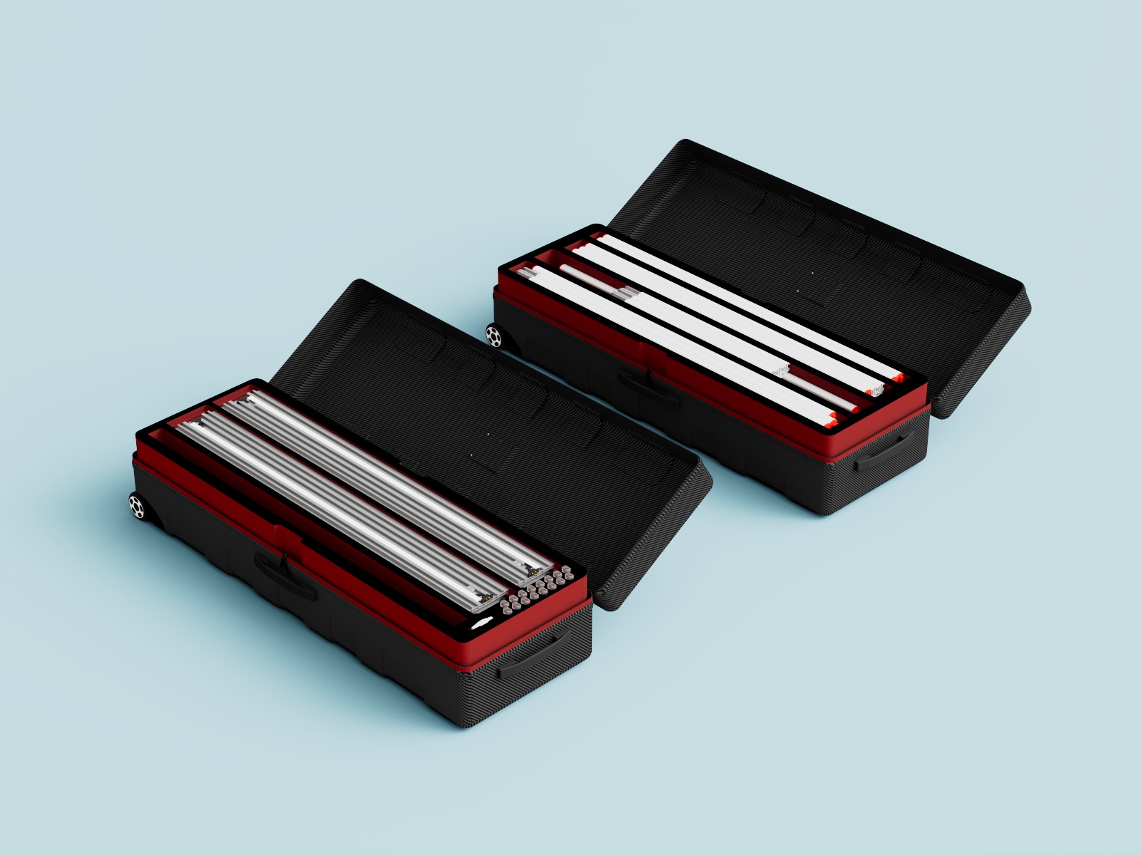 Das REAL BIG LEDUP™ Startmodul ist in zwei handlichen ABS-Hartschalenkoffer mit nur 120cm Länge, max. 40cm Breite und max. 31cm Höhe verpackt und lässt sich so problemlos in jedem PKW oder, in Verbindung mit anderen Systemen, auf einer kostengünstigen Europalette transportieren.